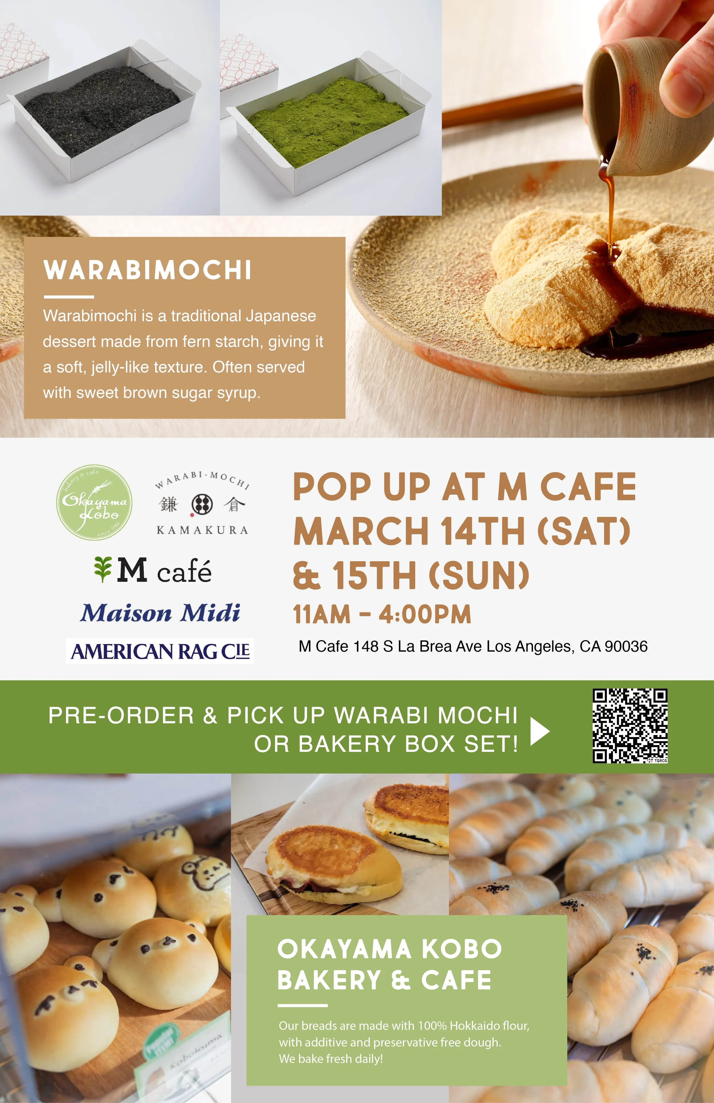 Pop-Up: Warabimochi x Okayama Kobo at M Cafe Saturday, March 14, 2026 11:00 AM Sunday, March 15, 2026 4:00 PM M Cafe La Brea Kitchen 148 S La Brea Ave Los Angeles (map) Google Calendar ICS Pre-order your Warabimochi, pick up fresh-baked bread from Okayama Kobo, and stay tuned for a few collaboration recipes we're not quite ready to reveal yet. Join us at M Cafe March 14 & 15, 11am–4pm. Pre-order Here